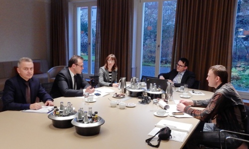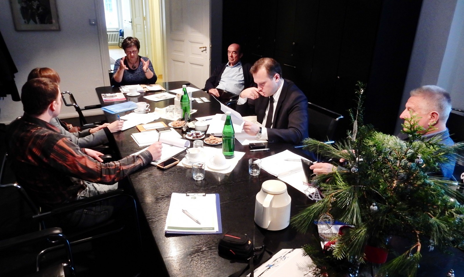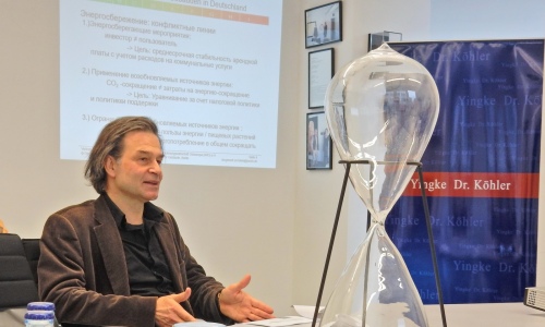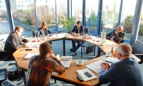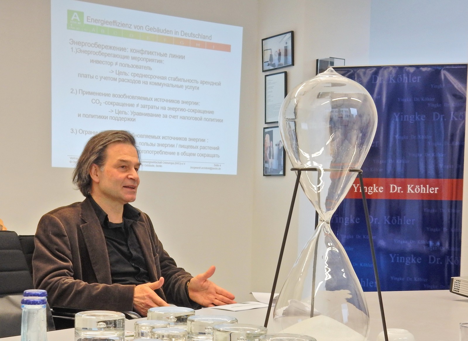Затем в офисе адвокатской компании состоялась встреча с Роландом Боргвардтом, архитектором, членом коллегии архитекторов Берлина, энергетическим консультантом по зданиям. Роланд Боргвардт подробно проинформировал о положительных причинах внедрения энергоэффективности в зданиях в Германии, о политических и потребительских фокусах энергоэффективности, о необходимости сперва сократить потребность в энергии зданий, а затем остаток покрыть из возобновляемых источников энергии. Роланд Боргвардт особый акцент сделал на важности политического микса: информировать собственников зданий + требовать от собственников зданий + поддерживать собственников зданий. Только такая политика при проведении модернизации зданий даёт устойчивый положительный результат. Были подробно рассмотрены и изучены три фазы проведения энергоэффективной санации зданий и энергетическая сертификация зданий.
