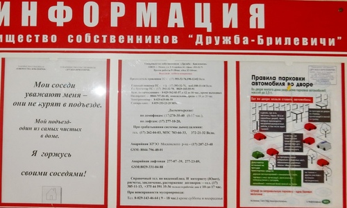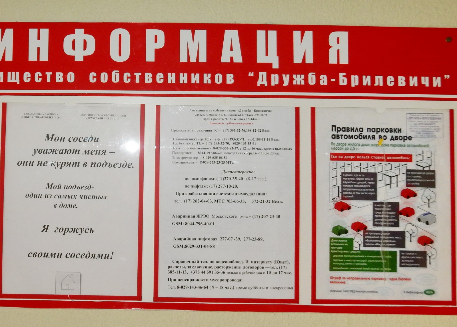 Информационные стенды находятся в помещении ТС и во всех подъездах всех домов. У входов в подъезды доски объявлений покрыты специальным составом, который препятствует "приклеиванию" объявлений и их легко можно снять (удалить).